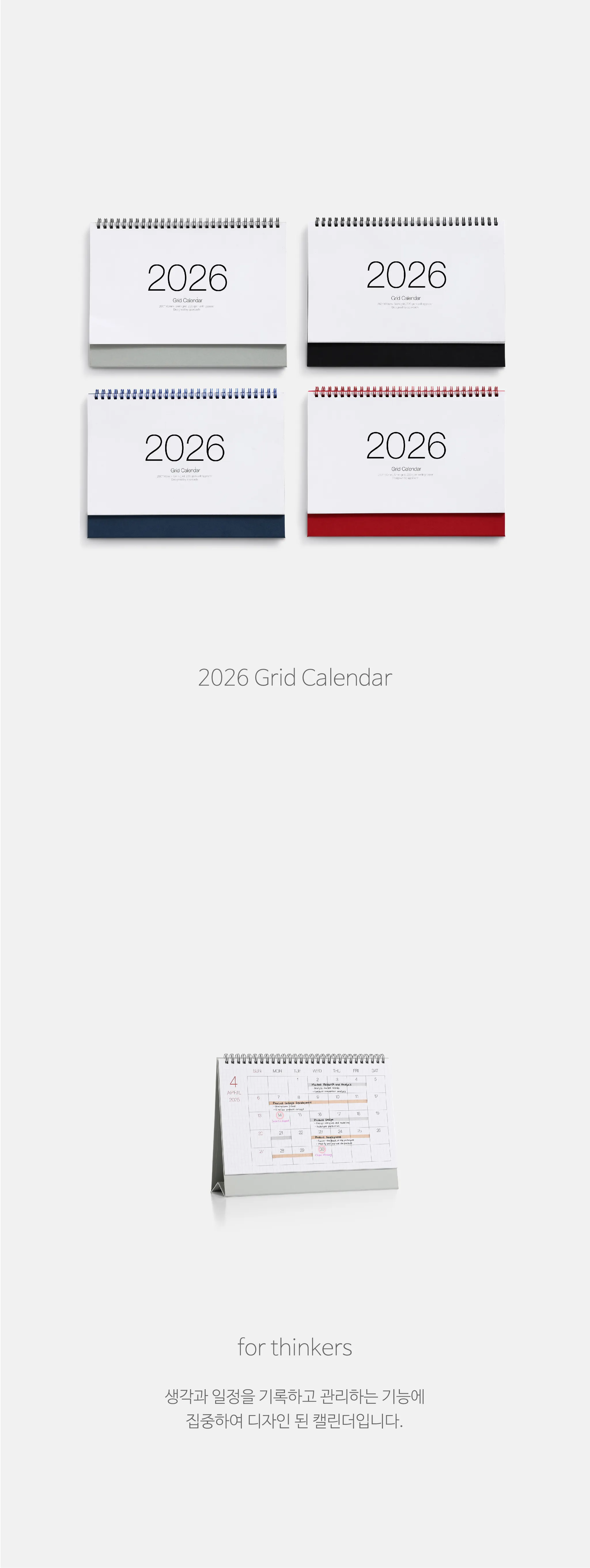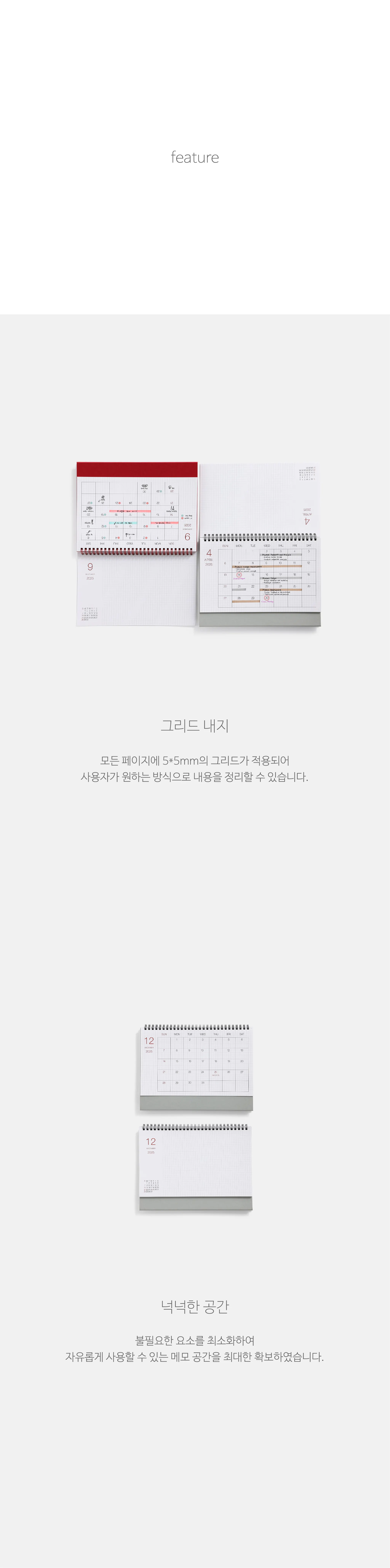 어프로치의 2025 캘린더로 그리드 디자인을 이용한 메모 공간 극대화를 특징으로 합니다. 4가지의 다양한 컬러로 출시되어 브랜드 컬러와 유사한 컬러를 선택하여 브랜드 굿즈를 제작할 수 있다는 장점이 있습니다.