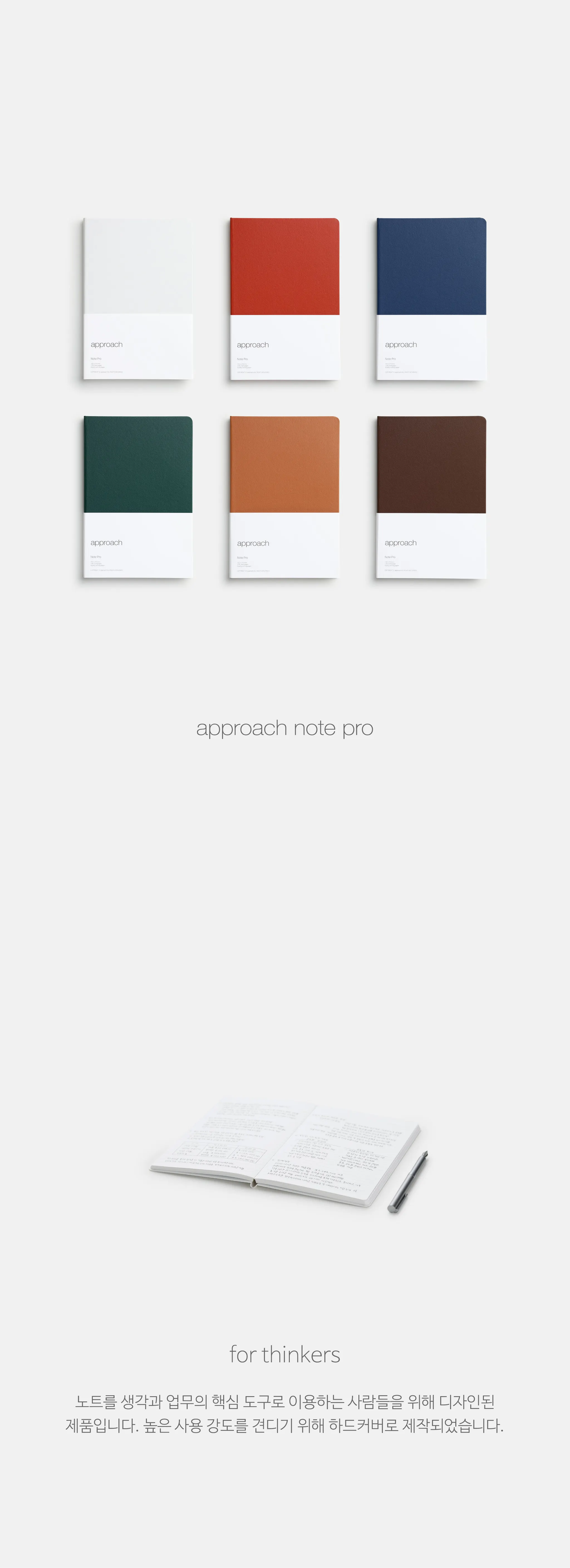 어프로치의 하드커버 노트 라인으로, 심플하고 세련된 마감 처리를 특징으로 합니다. 견고한 사철제본으로 작업되었으며 7가지의 다양한 컬러로 출시되어 브랜드 컬러와 유사한 표지 컬러를 선택하여 굿즈를 제작할 수 있다는 장점이 있습니다.