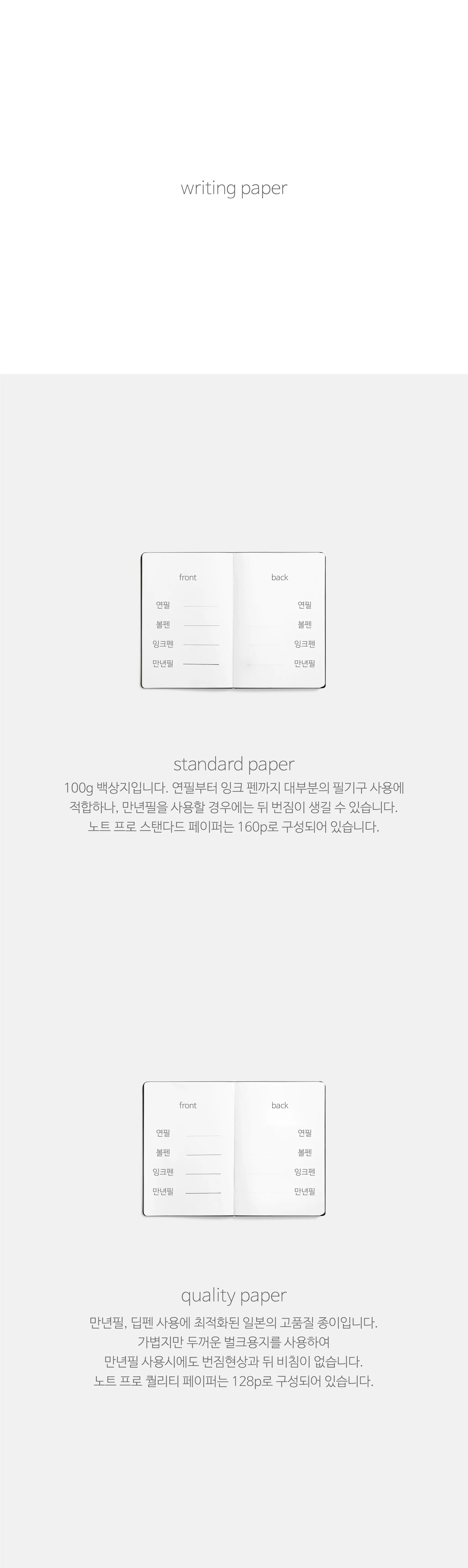 * 스탠다드 페이퍼는 일반 필기용지이며 퀄리티 페이퍼는 만년필 사용에도 번짐과 비침이 없는 고급 필기용지로 스탠다드 페이퍼 제품보다 가격이 비쌉니다. |